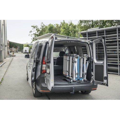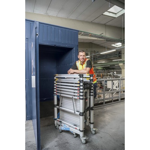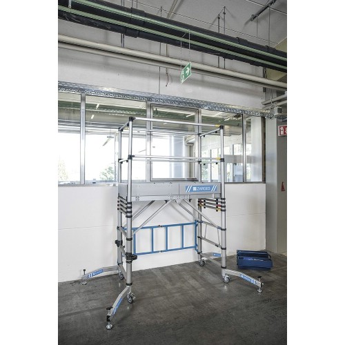 Kompakt och mobil rullställning med teleskopfunktion. Tillverkad av eloxerad aluminium som inte svärtar händerna. Teleskopfunktionen medger inställning av 5 olika plattformshöjder från 1 m upp till 2 m (arbetshöjd från 3 m till 4 m). Stor aluminiumplattform (1,4x0,6 m) med genomgångsöppning. En person kan själv sköta montering och demontering, komplett monterad på tre minuter. Lätt att förflytta, ihopfälld får den plats genom smala dörrar och i hissar, får plats i de flesta lastutrymmen, även i mindre fordon. Försedd med avståndshållare för att minska risken för klämskador vid montering och ihopfällning. Justerbara stödben. Låsbara länkhjul Ø 100 mm. Med sparklister och inbyggda hand- och knästrävor.