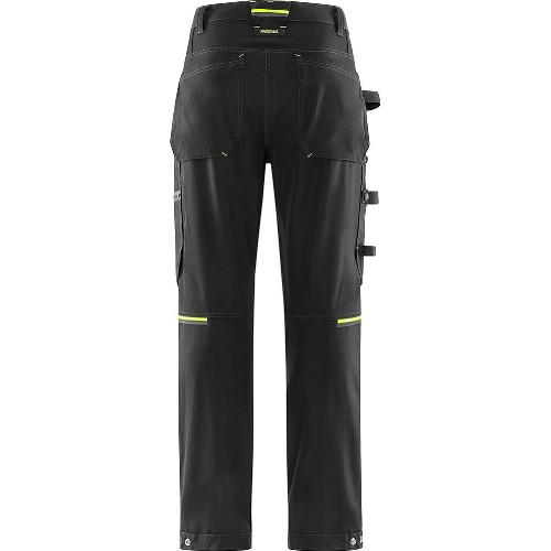 Hantverksbyxor i slitstarkt lättviktsmaterial med 4-vägsstretch. Ingår i Fristads Flex Solution där spikfickorna köps separat och fästs med dolda magnetknappar och tryckknapp vid linningen. Delvis återvunnet material från textilt avfall. 2 framfickor, en med invändig D-ring. 2 Cordura-förstärkta bakfickor. Rymlig benficka av Cordura som även kan användas för tumstock, extra ficka med dragkedja. Tumstocksficka av Cordura med verktygsficka, pennficka och 2 knappar samt hälla för knivar, passar även dubbelt knivhölster. Hammarhank. Dold knapp i midjan. Dubbel förstärkt grensöm. Knäfickor i Cordura med öppning inifrån. Knäskydden i knäfickorna kan höjdjusteras. Cordura-förstärkta benslut, reglerbara med tryckknappar. Reflexdetaljer vid knän och bakben. PFAS-fri. Tvätt 60°C.